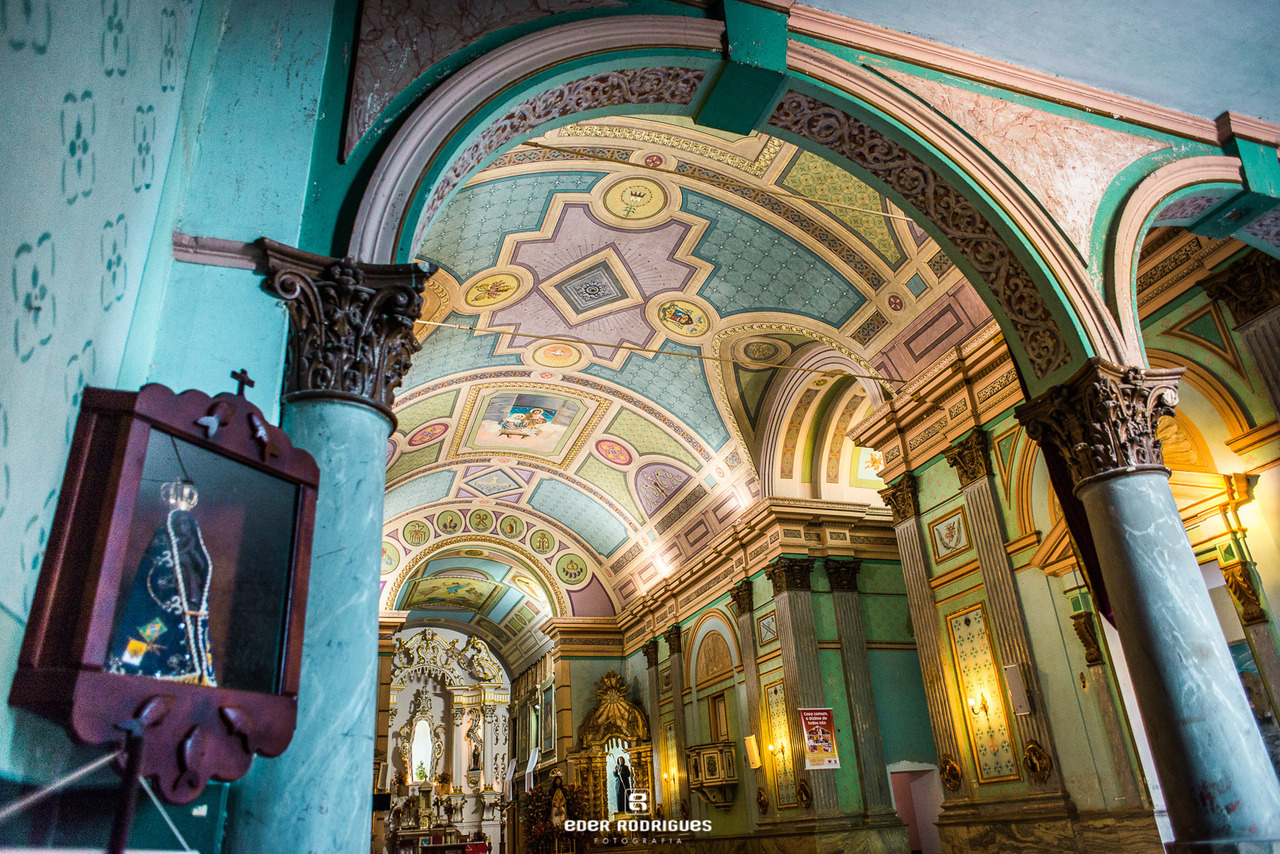 A fachada da igreja é bastante imponente, com duas torres laterais e um frontão triangular no topo. A entrada principal é adornada com colunas e entalhes em relevo. O interior da igreja é amplo e bem iluminado, com um altar-mor decorado com imagens sacras e pinturas emolduradas. A igreja é de origem colonial e incorpora elementos do século XIX pela própria devoção, a Basílica, construída em taipa de pilão, foi um dia mais simples. O que vemos hoje evoca um caráter eclético, por causa das decorações de mestres italianos e os altares que imitam mármore. Toda a pintura do altar-mor tem um traço mais recente, a original talvez fosse de fundo mais branco e frisos dourados. Isso é o que muitos historiadores chamam de rococó tardio. As colunas fogem dos desenhos dos altares laterais barrocos por terem um desenho mais clássico.